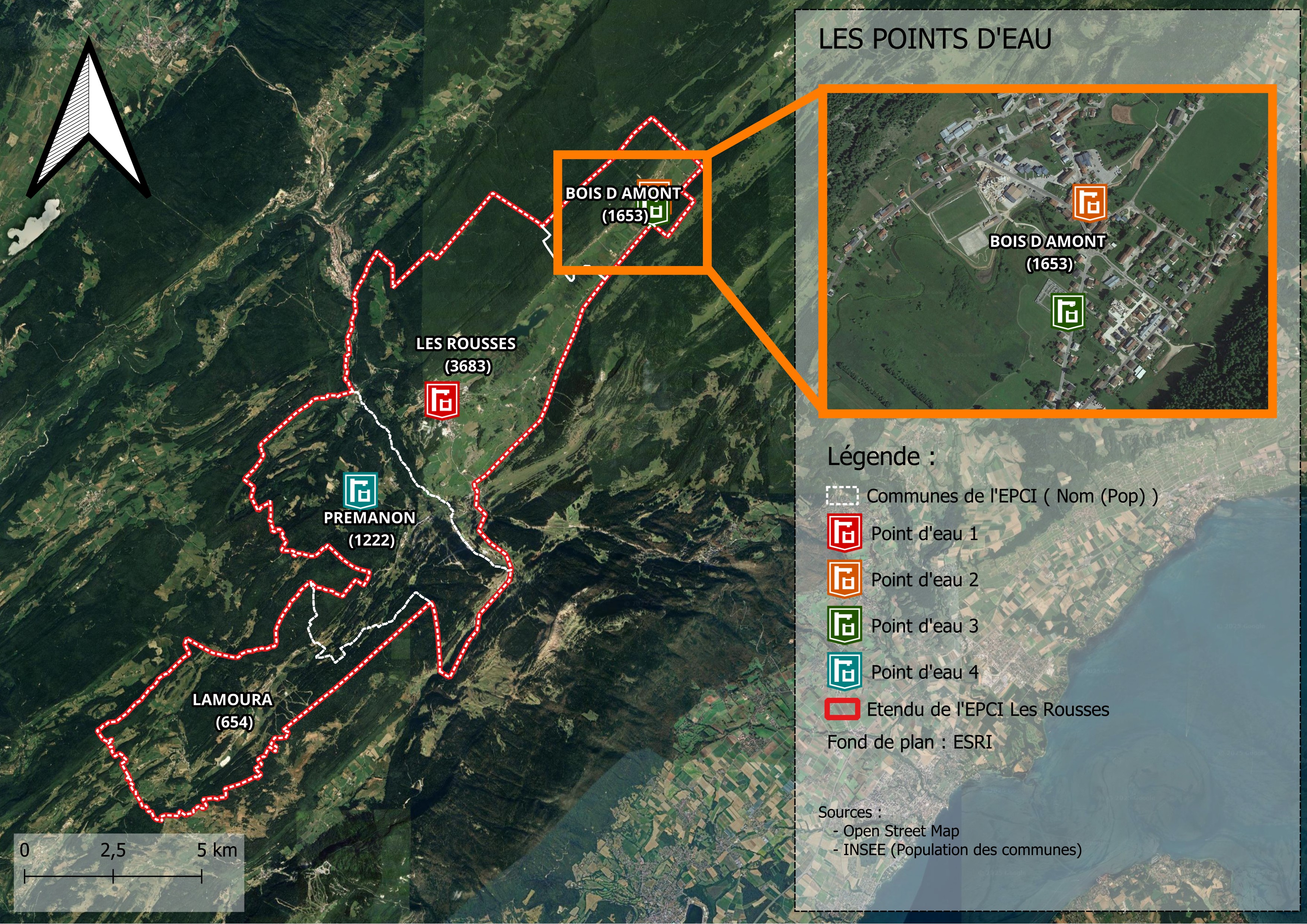 D'abord la première chose que l'on peut voir cette carte, c'est qu'il y a deux points d'eau sur la même commune, celle de Bois d'Amont, cela est un cas plutôt intéressant je trouve, puisque cela va rajouter un peu de concurrence.