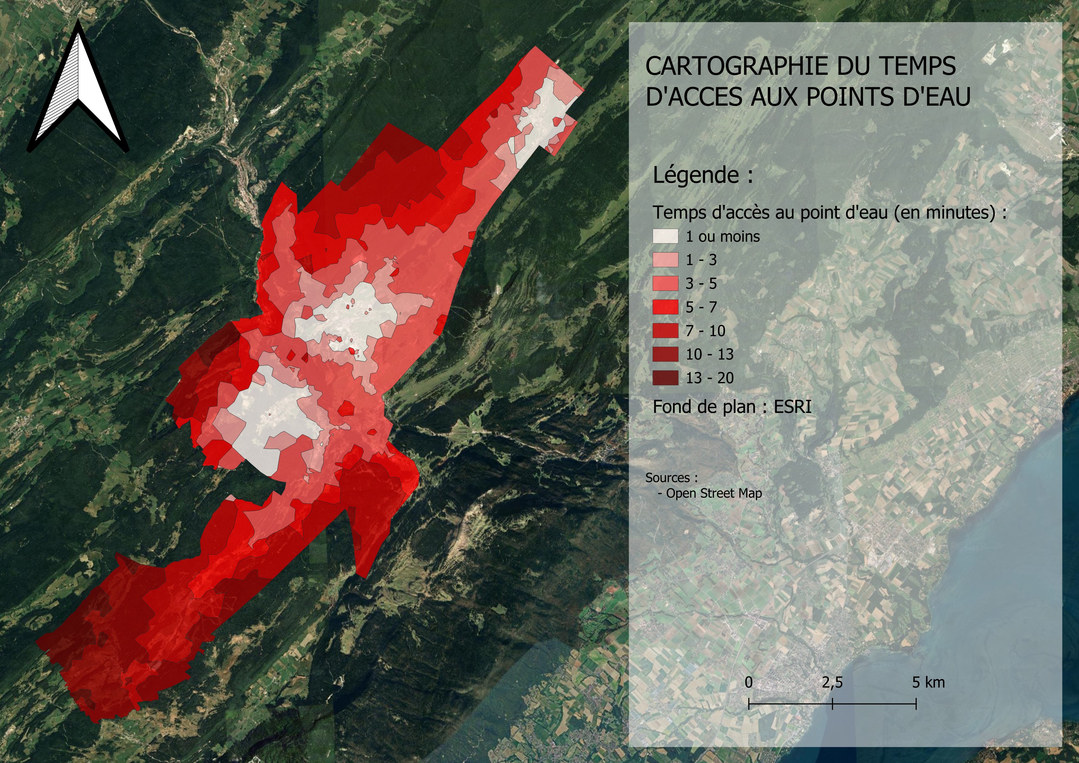 - La première carte montre le temps d'accès aux points d'eau depuis les différents noeuds, le tout regroupé en cluster. Et on peut voir que plus on s'éloigne de nos axes principaux, plus le temps augmente assez rapidement. Cela est d'ailleurs le cas pour la zone au Sud entre les points 1/4, car malgré une concurrence assez forte entre ces deux points, le temps pour accéder au point d'eau est relativement important, du fait que les routes ne sont pas vraiment directes. L'autre élément que l'on peut distinguer, est le cas de la commune de Lamoura, du fait qu'elle n'a pas de point d'eau sur son territoire et que le plus proche est celui de la commune de Preymanon, l'ensemble de son territoire a des valeurs relativement importantes.